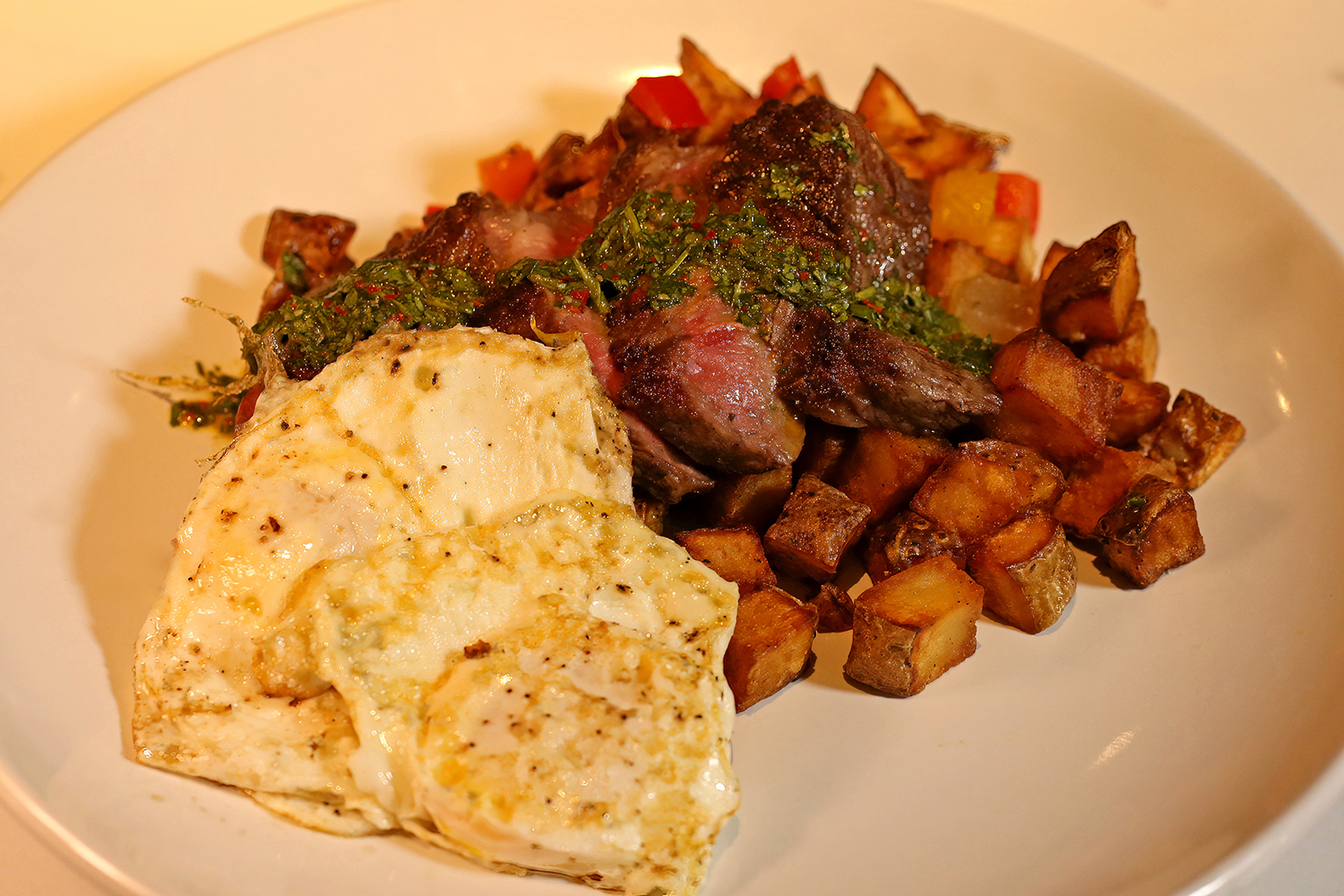 6 oz. strip steak, potato hash, 2 eggs over easy, chimichurri